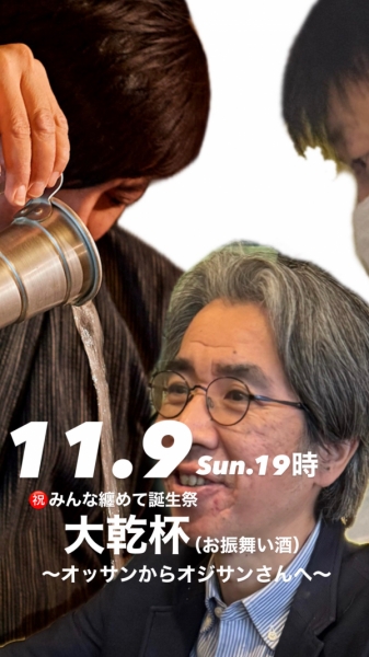 今月45歳になる店主。これまで24時間まるたけや歌手をお呼びしての前前前夜歌謡祭など、誕生日に絡めていろいろな企画をしてまいりましたが、今年は常連さんとウチの社員を含めた「みんな纏めて誕生祭〜オッサンからオジサンへ〜」と称して11月9日(日)19時に大乾杯(お振舞い酒)を行います。